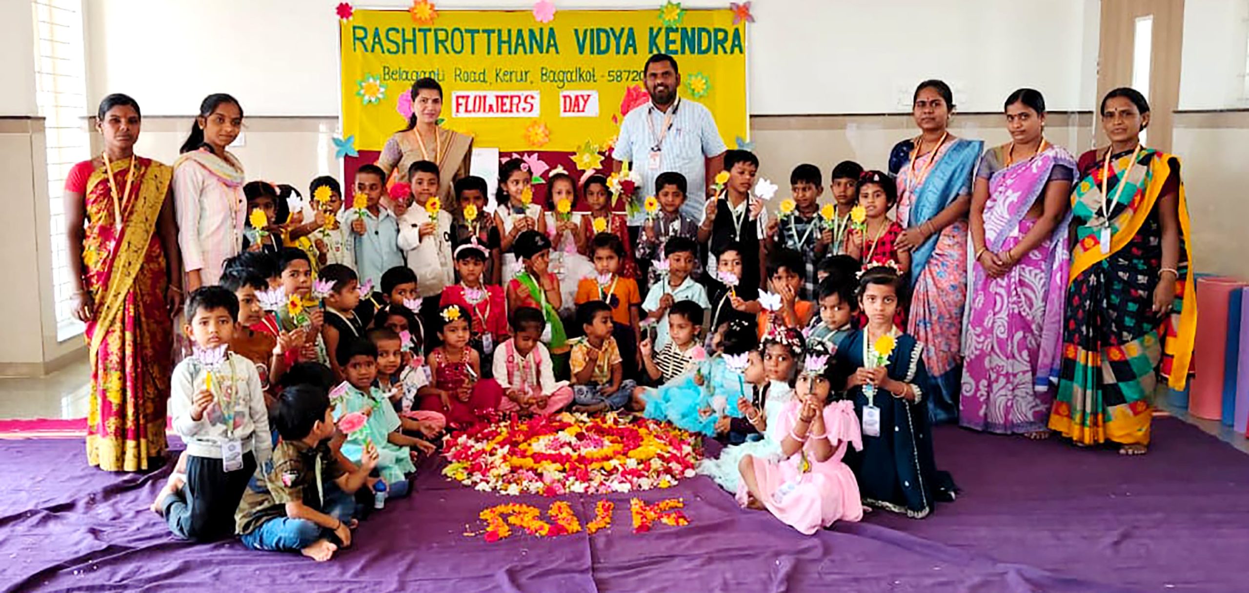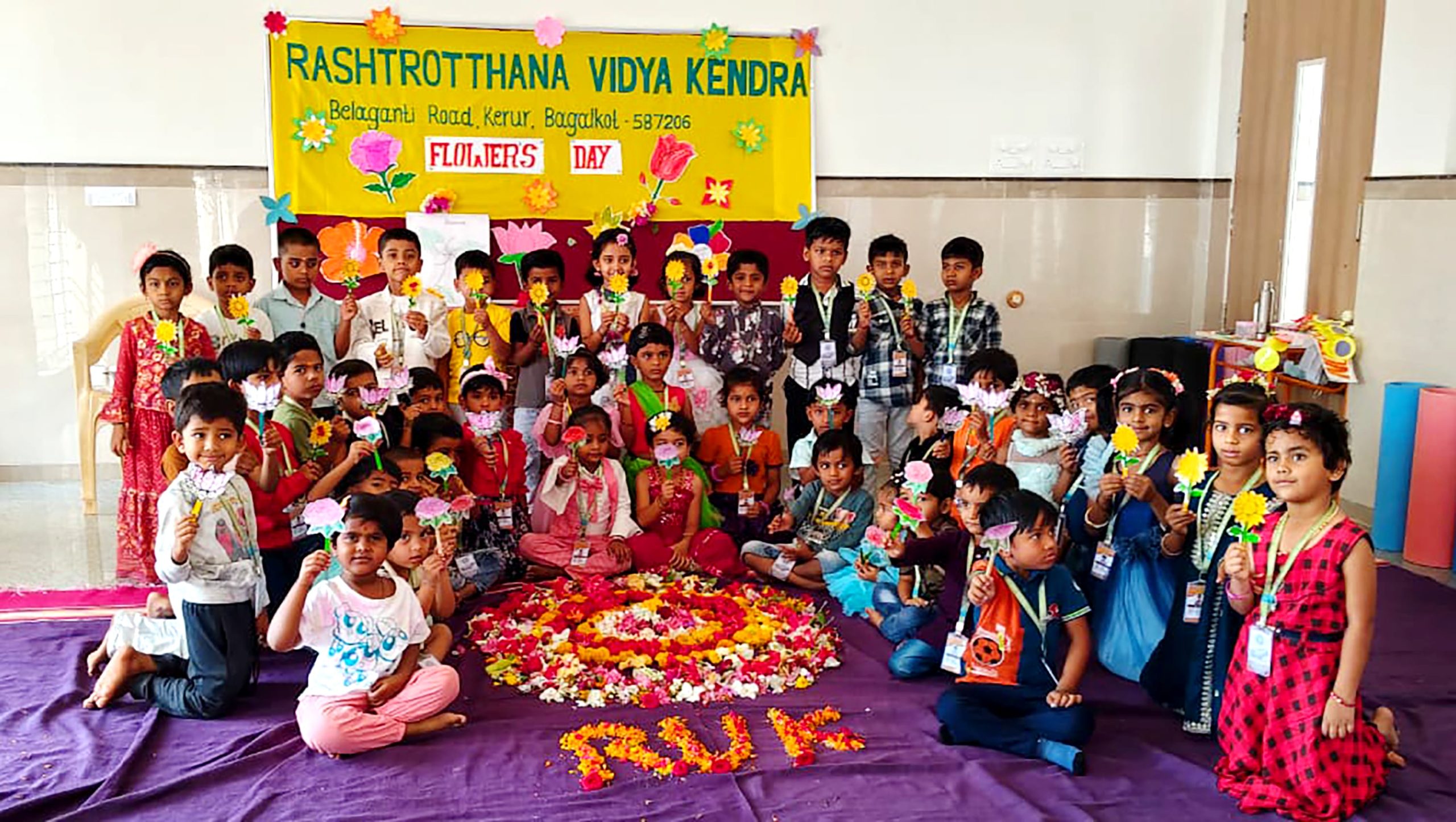 ಕೆರೂರ್, ಫೆ. 19: ರಾಷ್ಟ್ರೋತ್ಥಾನ ವಿದ್ಯಾಕೇಂದ್ರ – ಕೆರೂರಿನಲ್ಲಿ ಗೋಕುಲಂ ವಿದ್ಯಾರ್ಥಿಗಳು ಹೂವಿನ ದಿನವನ್ನು ಆಚರಿಸಿದರು. ಶಿಕ್ಷಕರು ಹೂವಿನಿಂದ ರಂಗೋಲಿಯನ್ನು ಬಿಡಿಸಿದರು. PRE-KG ಮಕ್ಕಳು ಹೂವುಗಳ ಬಣ್ಣ ಬಳಿಯುವುದು, LKG ಮಕ್ಕಳು ಹೂವುಗಳ ಮೇಲೆ ಕಿವಿ ಮೊಗ್ಗುಗಳ ಚಟುವಟಿಕೆ ಮತ್ತು UKG ಮಕ್ಕಳು ಹೂವುಗಳ ಮೇಲೆ ಬೆರಳಚ್ಚು ಅದ್ದುವ ಚಟುವಟಿಕೆಯನ್ನು ನಡೆಸಿದರು. ಕು. ಸಾಕ್ಷಿಸಿಂಗ್ ಹೂವುಗಳನ್ನು ಆಭರಣದಂತೆ ಧರಿಸಿದ್ದಳು. ಎಲ್ಲಾ ಮಕ್ಕಳು ಗುಲಾಬಿ, ಮಲ್ಲಿಗೆ, ಮಾರಿಗೋಲ್ಡ್, ಕ್ರೈಸಾಂಥೆಮಮ್, ಪೆರಿವಿಂಕಲ್, ಮಾರ್ನಿಂಗ್ ಗ್ಲೋರಿ ಮತ್ತು ಹೆಬಿಸ್ಕಸ್ ಮುಂತಾದ ವಿವಿಧ ರೀತಿಯ ಹೂವುಗಳನ್ನು ತಂದಿದ್ದರು. ಕೆಲವು ಮಕ್ಕಳು ಹೂವಿನಿಂದ ಬೊಕೆಯನ್ನು ತಯಾರಿಸಿದರು.