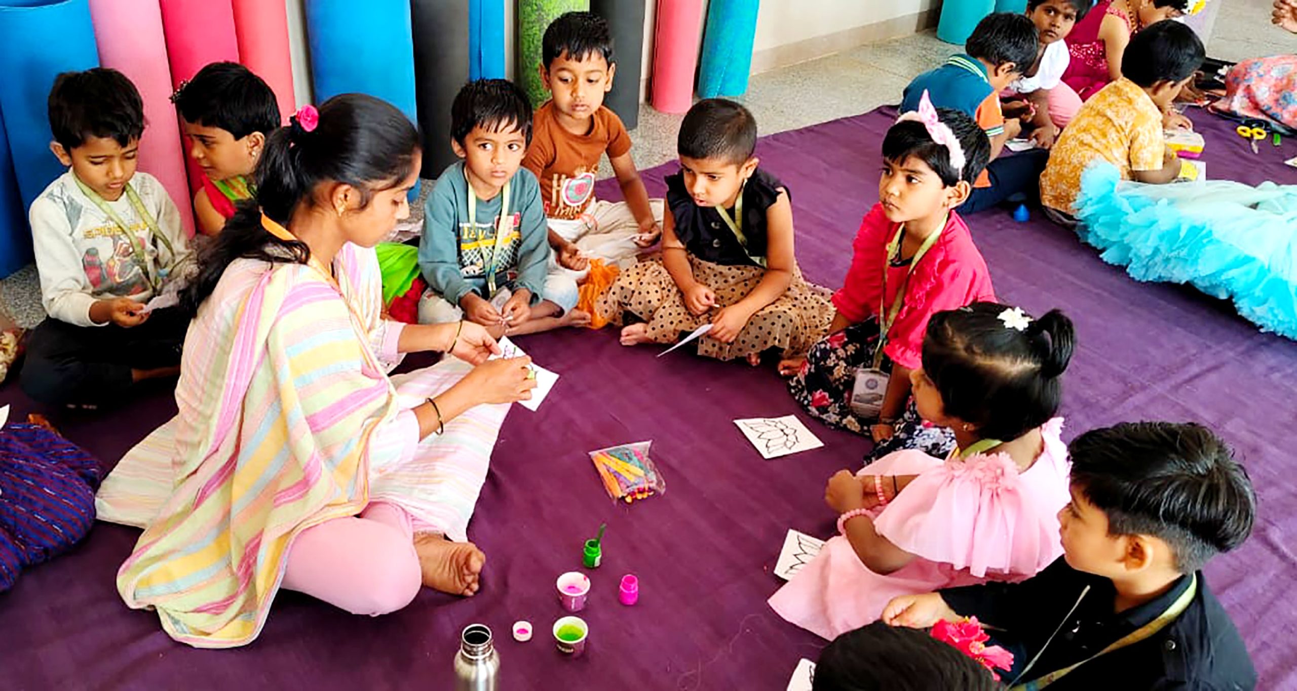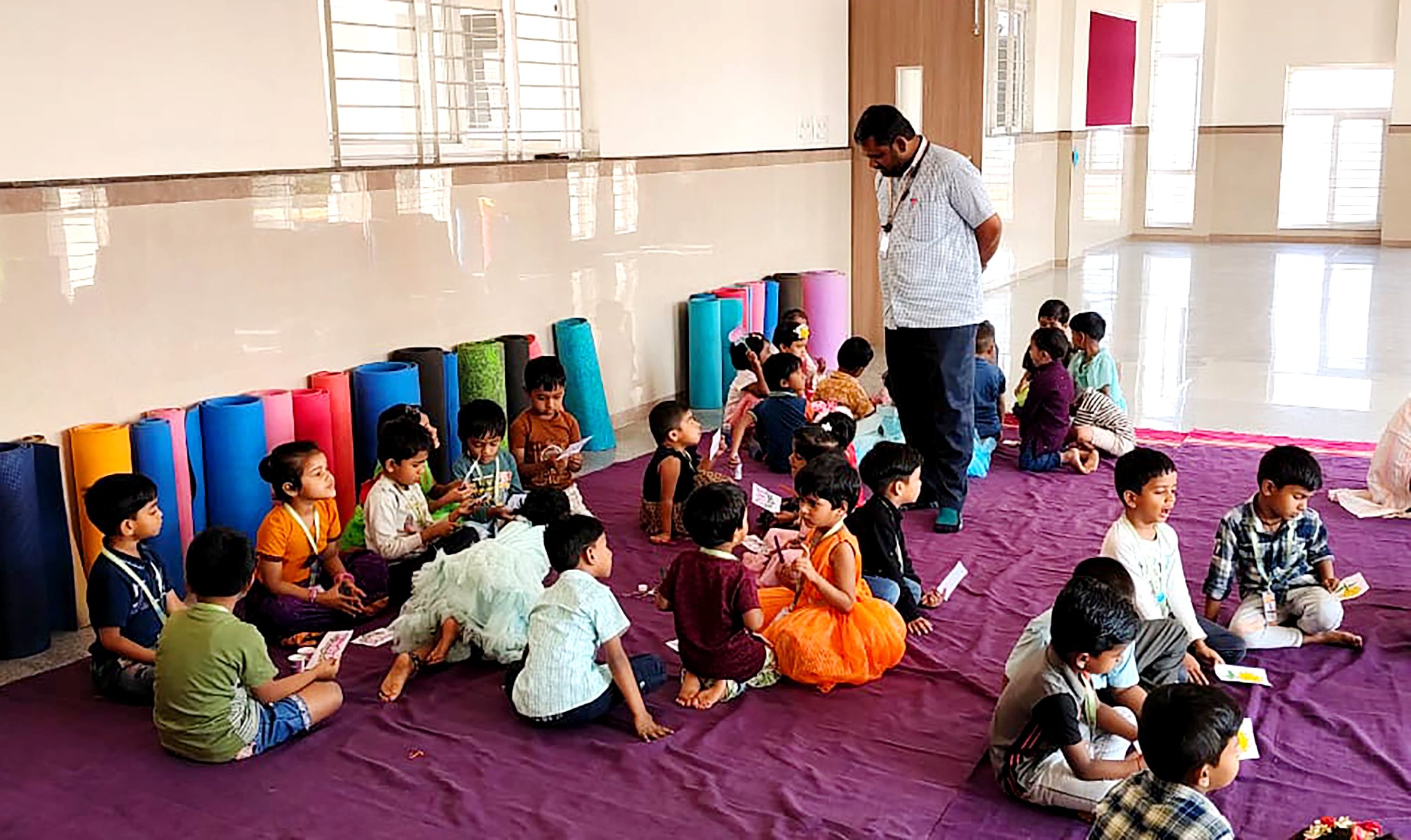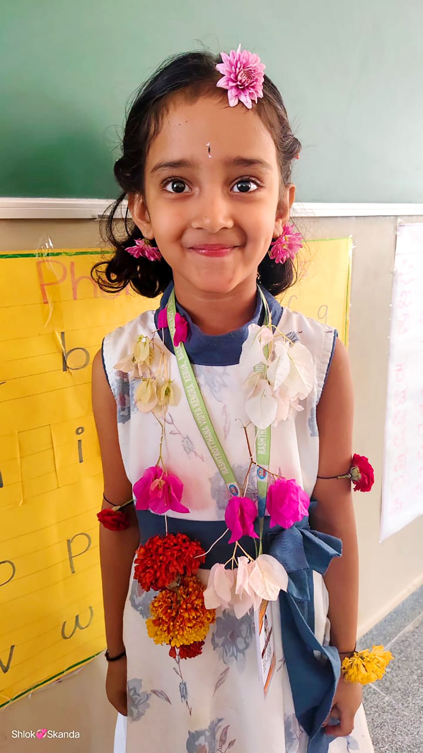 Kerur, Feb. 19: Students of Gokulam celebrated ‘Flower Day’ herein Rashtrotthana Vidya Kendra – Kerur. Teachers drew Rangoli with flowers. PRE-KG children conducted activities like painting flowers, LKG children did ear bud activity on flowers and UKG children did fingerprint dipping on flowers. Ku. Sakshi Singh wore flowers as ornaments. All the children brought different types of flowers like rose, jasmine, marigold, chrysanthemum, periwinkle, morning glory and hibiscus. Some children made bouquets with flowers.