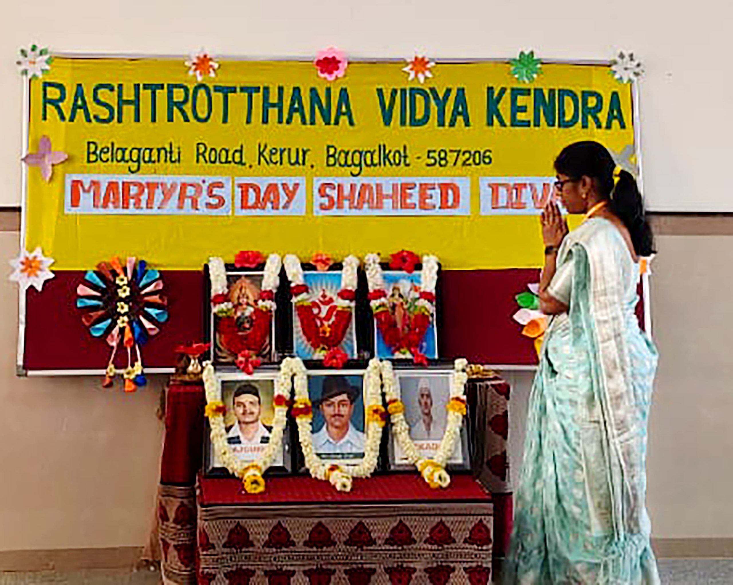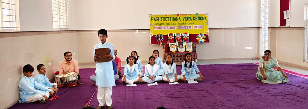 Kerur, Mar. 22: Martyrs’ Day was celebrated herein Rashtrotthana Vidya Kendra – Kerur.Speaking about the importance of Day Kartik Yatanur of class 5, said, leaders like Bhagat Singh, Sukhdev, Rajguru made sacrifices for the country. He said that it is our responsibility to follow their values.Later, the Principal gave information about Martyrs’ Day.