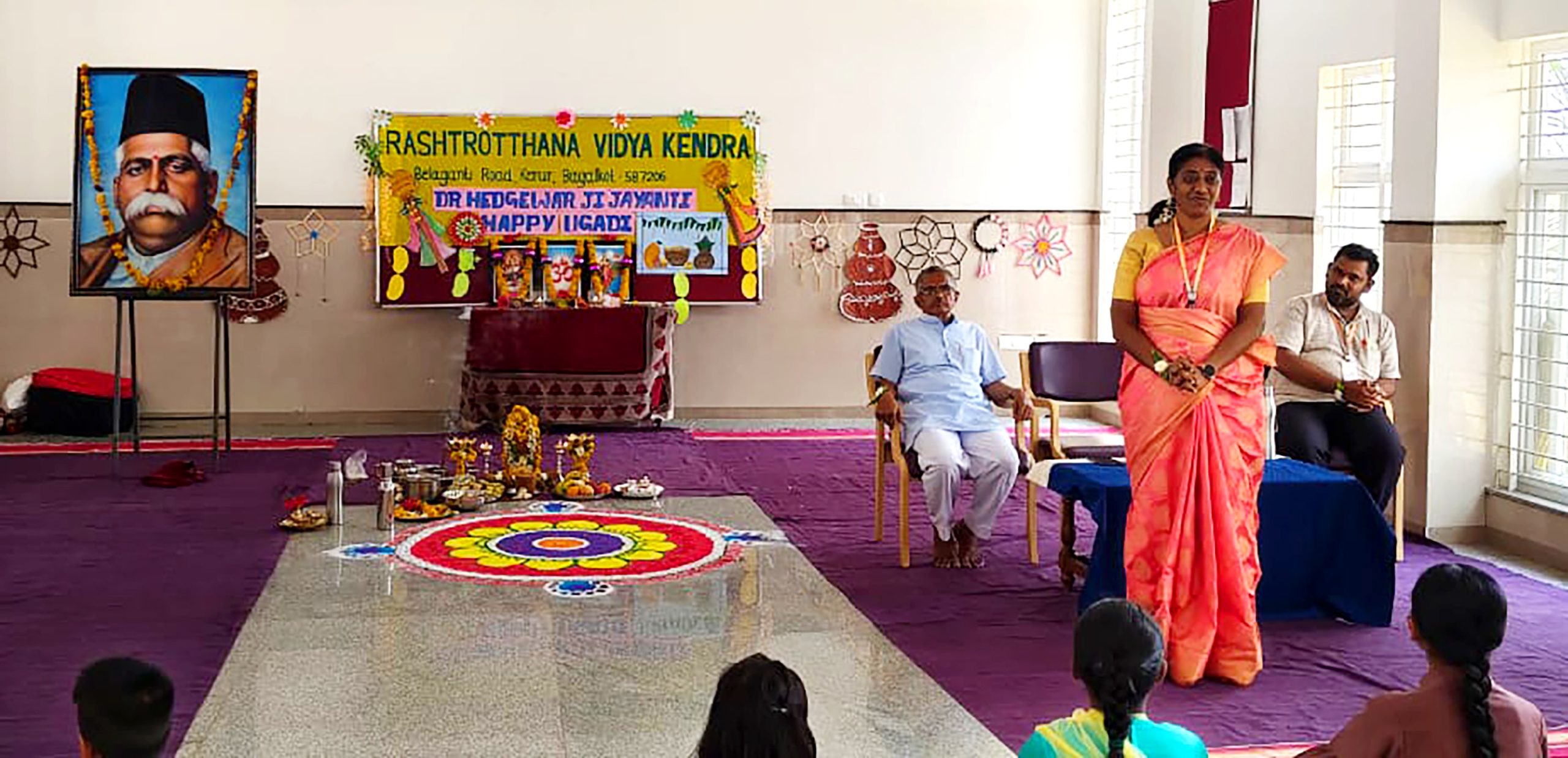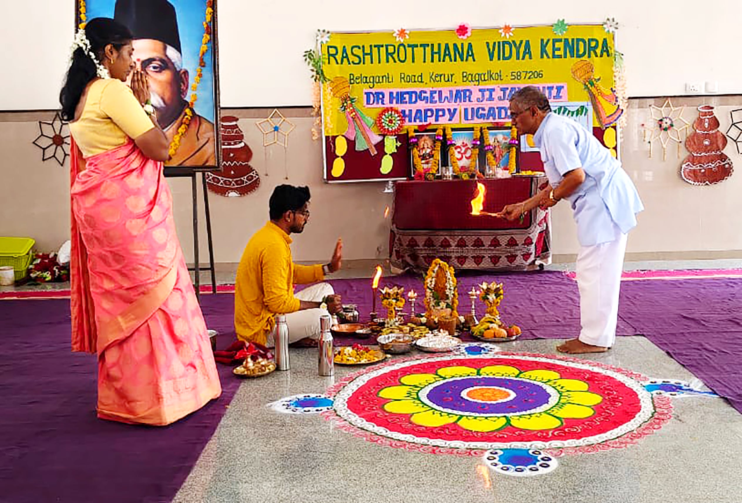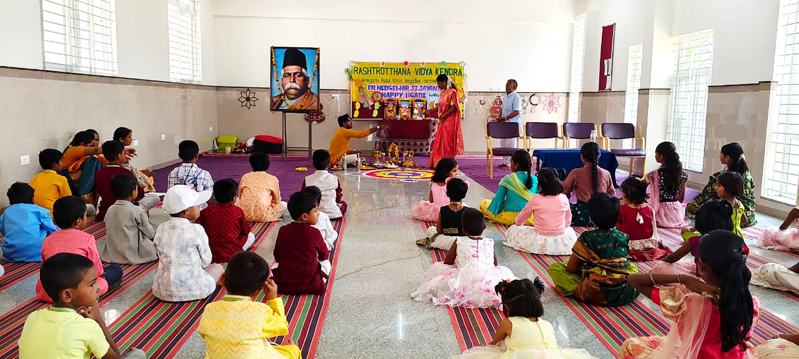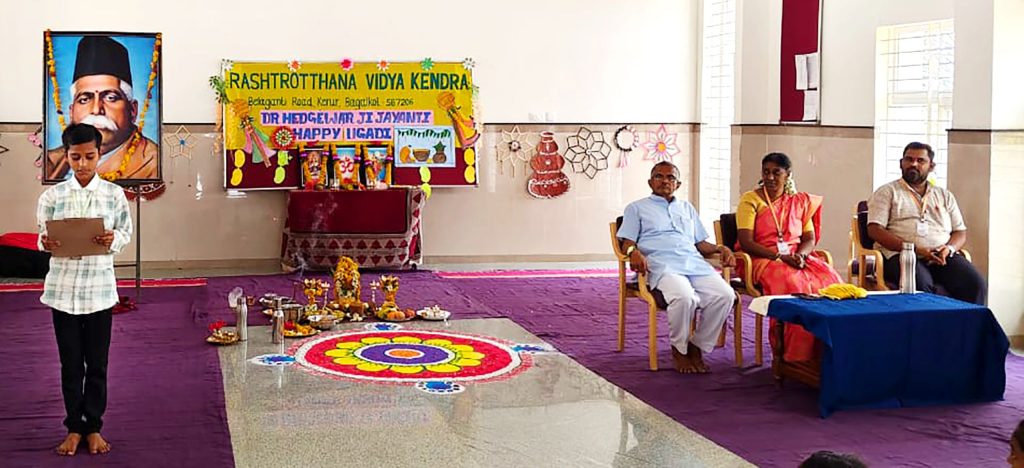 Kerur, Mar. 29: Yugadi festival was celebrated herein Rashtrotthana Vidya Kendra – Kerur. The program started with traditional puja. Children gave information about the festival. The Pradhanacharya spoke about the cultural and traditional importance of Yugadi. Also, on this occasion, Hedgewar, the founder of Rashtriya Swayamsevak Sangh, was remembered. At the end, neem jaggery was distributed.